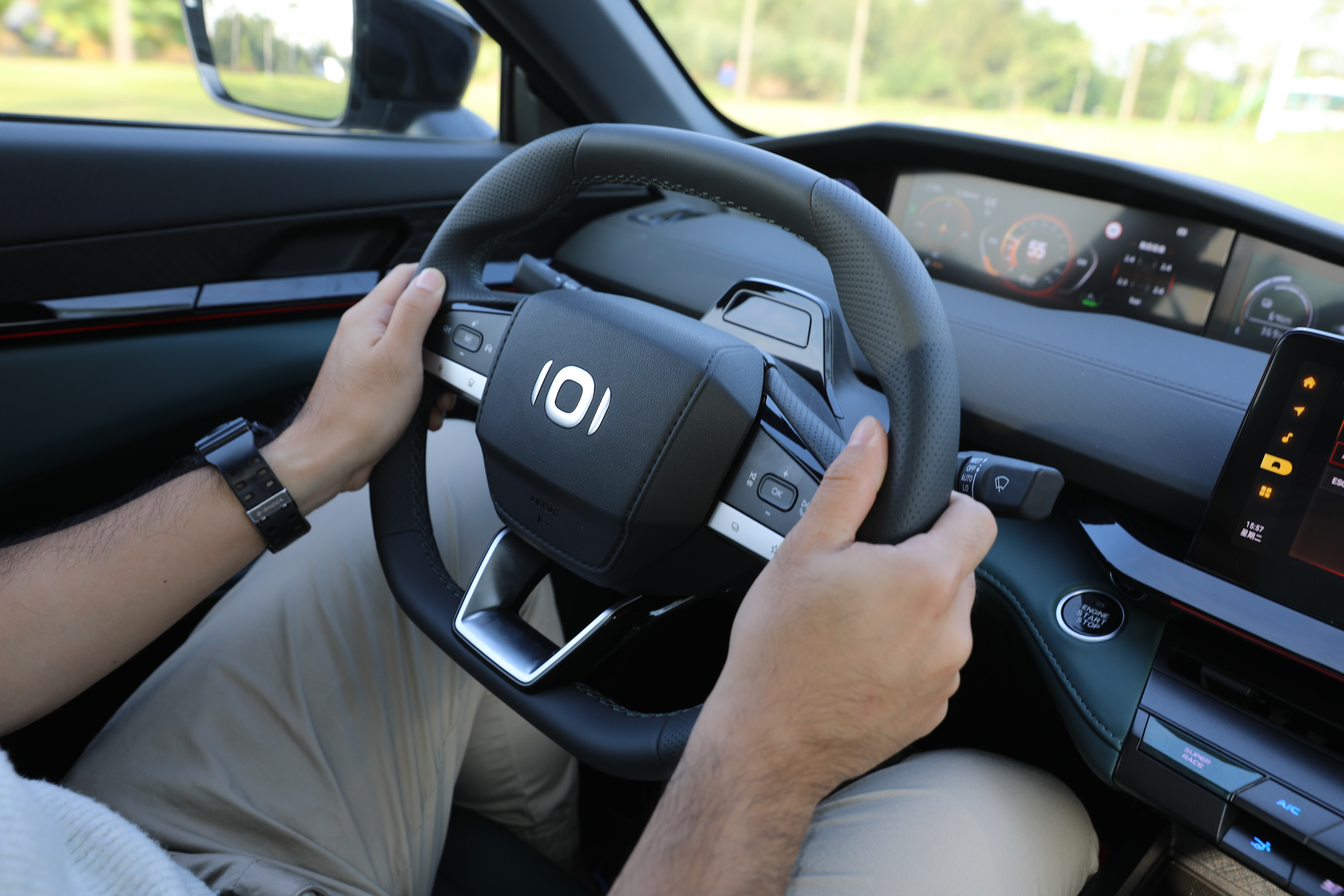 智能驅動模式能夠幫助車輛在不同電量狀態(tài)下,以最優(yōu)的驅動結構對動力進行分配,而當筆者啟動SUPER RACE模式,首先映入眼簾的是儀表盤、中控屏切換到更激進的界面UI,其次,車輛的動力進入到嚴陣以待的狀態(tài),油門響應更為積極,配合模擬聲浪,整車的運動氣質完全展現(xiàn)出來。